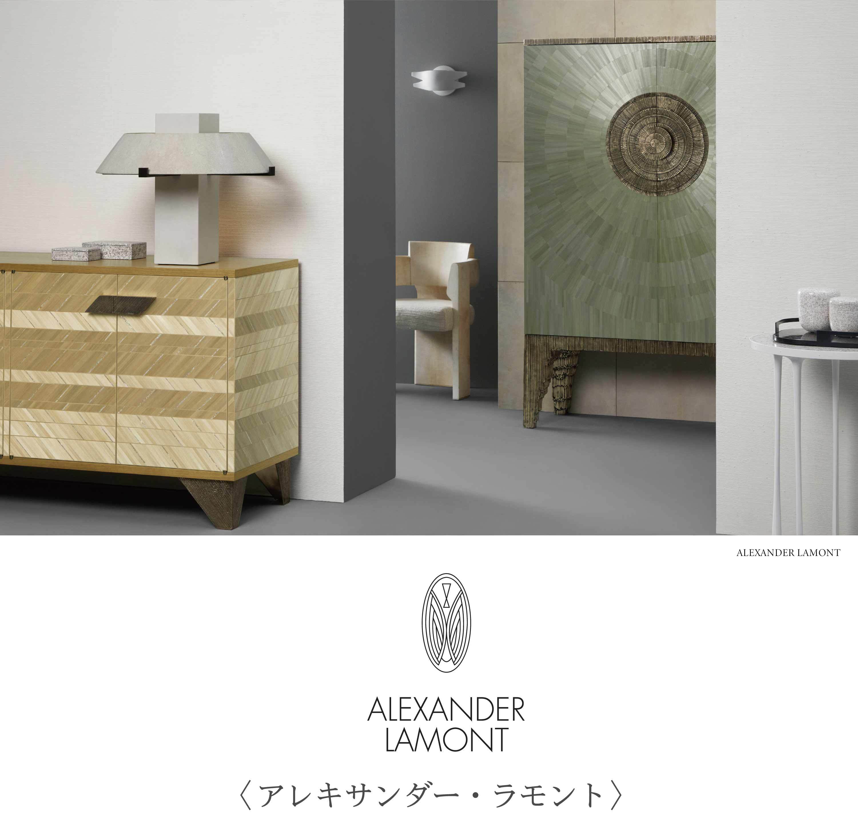 イギリス人デザイナーのアレックスが 2000 年に設立し、家具・照明・装飾小物・アートパネルなどを製作するブランド<アレキサンダー・ラモント>。コレクションをもっとも特徴づけるのは、ヨーロッパ 20 世紀初頭のアールデコの室内装飾にインスパイアされる、ブロンズ・シャグリーン・漆・ストローの寄木細工・パーチメントといった類い稀な素材。とても美しくエキゾチックなコレクションです。