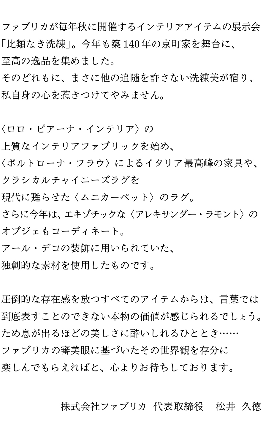 ロロ・ピアーナがインテリア用コレクションの開発を始めた際、その背景にあったのは、ロロ・ピアーナが衣服や小物製品に捧げるエレガンス、最高の品質、機能性、それらを備えた室内装飾製品を作るというアイデアでした。<ロロ・ピアーナ・インテリア>の生地は、柔らかく包み込まれるような最高級のカシミアやウール、リネン、シルク、コットンから慎重に作られており、アイテムには、カーテンや椅子張り用の生地、ラグ・カーペット、そして最高に心地よい手触りのブランケットが揃っております。期間中はエリアマネージャーが来日し、特別誂えのベッドリネン、テーブルマット、バスタオルのサンプルをご希望のお客様へ個別にご紹介予定です。